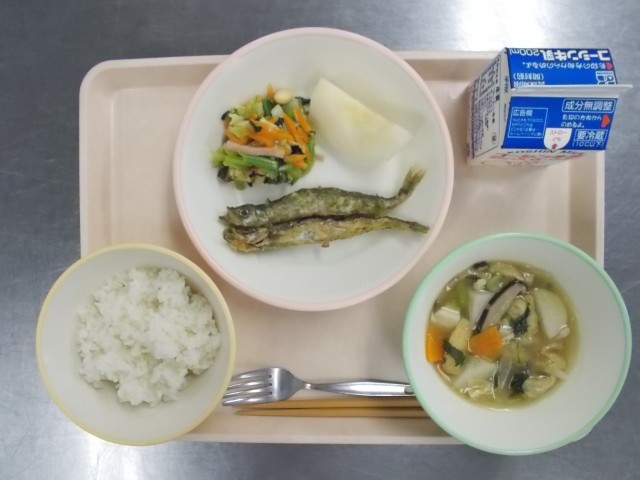 ごはん・牛乳・ししゃもの磯辺揚げ・小松菜サラダ・のっぺい汁・果物:梨(あかつき)