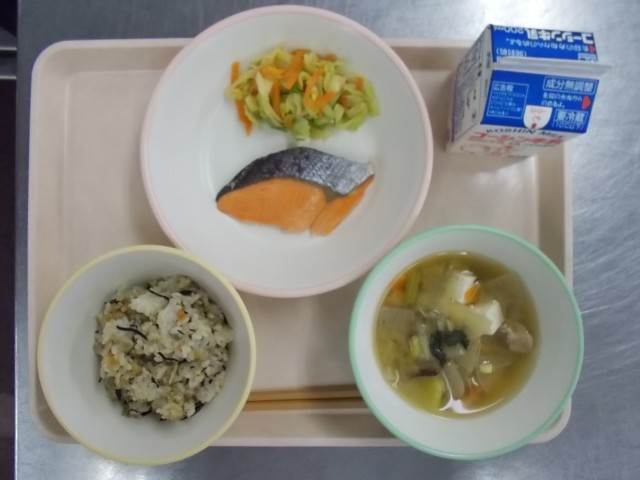 ひじきと大豆のごはん・牛乳・サケの塩焼き・キャベツとえのきのおひたし・さつま汁
