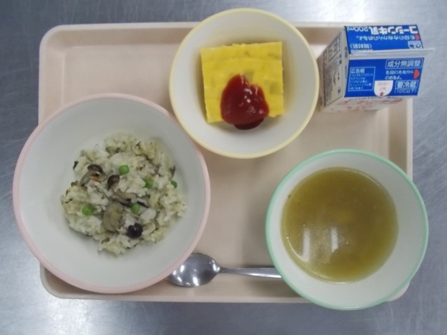 きのこピラフ・牛乳・スパニッシュオムレツ・オニオンスープ