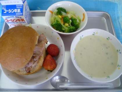 今日は鶏肉の照り焼きバーガーです。大きな口を開けてもぐもぐ食べましょう。スープはポタージュです。具を軟らかく煮たあとスープごと大きなミキサーでトロトロにします。寒い日には温かいポタージュがとてもうれしいです。温かいうちに食べましょう。お豆が苦手な人、実はいんげんまめが入っていました。気が付きましたか?