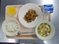 今日は沖縄がいっぱいのメニューです。沖縄風炊き込みご飯には焼き豚と昆布が入っています。ゴーヤチャンプルー、苦手な人もいるかもしれませんが、まずは一口食べてみましょう。ゴーヤは別名をにがうり、というほど苦い食べ物といわれています。しかし、炒めたり、玉葱の甘みや炒り卵の風味、かつお節の香りなどを加えることで苦みを感じなく食べることができます。おいしく食べましょう。