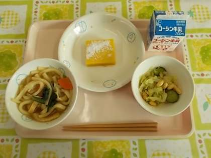 今日の給食の献立は、とりなんばんうどん、大豆入りサラダ、かぼちゃのケーキ、牛乳です。【行事食・・・冬至】
