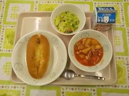 今日の給食の献立は、ツナフランス、チキンビーンズ、コーンサラダ、牛乳です。