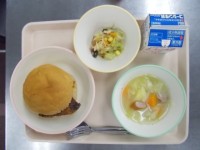 今日の給食の献立は、ヨーグルトトースト、チリコンカン、野菜スープ、、りんご、牛乳です。