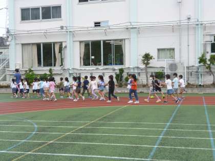 6月30日(水)4校時、1年生がプールへの行き方を学習していました。まずは校庭に並びます。間隔をあけて並べるかな?プールまで歩いて行きますが、今年はマスクを入れる袋をプールサイドにとめます。忘れずに持っていかないとね。