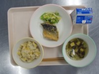 今日の給食の献立は、ごはん、かみかみ佃煮、牛乳、豆腐ナゲット、三色おひたし、かぶのみそ汁です。