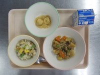 今日の給食の献立は、チキンカレー、牛乳、小松菜サラダ、りんごです。