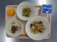 今日の給食の献立は、ごはん、そぼろ小松菜ふりかけ、牛乳、鶏の照り焼き、小松菜の和え物、けんちん汁です。