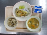 今日の給食のふりかけには、ちりめんじゃこ、切昆布、かつおぶし、白ごまが入っています。全校分を回転釜で作っているので手間がかかっています。とてもおいしいので残さず食べましょう。