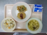 今日の給食吹き寄せごはん・牛乳・大豆のコロッケ・もやしのおひたし・豆腐とわかめの...
