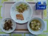 今日の給食の献立は、ごはん、鮭のレモンしょうゆ焼き、野菜の炒め煮、田舎汁、牛乳で...