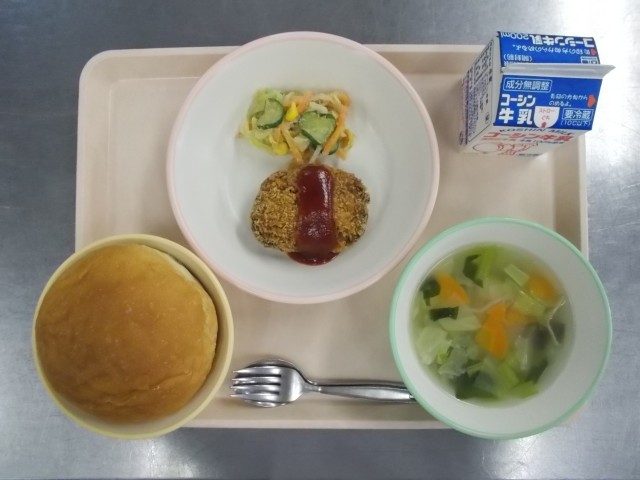 今日の給食丸パン・牛乳・キャベツいっぱいメンチ・ごまドレサラダ・野菜スープ 今日...