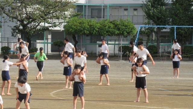 1枚目の写真は『4年生』。上南小4年の【伝統】になっている「ソーラン節」に今年度も挑戦します!  代表児童の「構え!」の掛け声がかかると、全員が低い姿勢をとり、表現がスタート! 昨日の1・2年生同様、既に「基本の振付」は子どもたちの中に入っており、表現をしながら『隊形移動の確認』も行っていました。授業後半、担任から「疲れてきたのか~?」とハッパをかけられると、それに呼応して子どもたちの「どっこいしょ~、どっこいしょ!」「ソーラン、ソーラン!」の声が大きくなりました! これからはさらに完成度を高めていく段階に入っていくことでしょう。