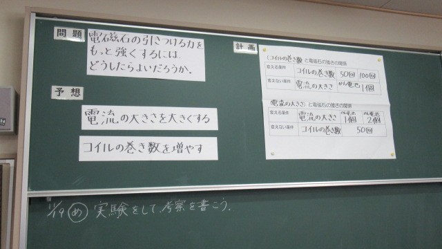 9月は2年生の「算数」で研究授業を行い、11月は5年生の「理科」で研究授業を実施しました。今回の5年生の実践では、子どもたちの学習意欲や問題解決への意欲を高めるために、単元の「導入を工夫」するとともに、「もっと知りたいこと、これから調べていきたいこと」を子どもたちから吸い上げ、掲示物にまとめました。当日の授業は、「問題把握」→「予想」→「実験計画」→「実験」→「考察」と流れていきます。「考察」をうまくまとめられない児童のために、「まとめ方の【例】」を提示し、自分の言葉でまとめる『支援』を行いました。その後、グループで「考察」を整理し、先生に報告。