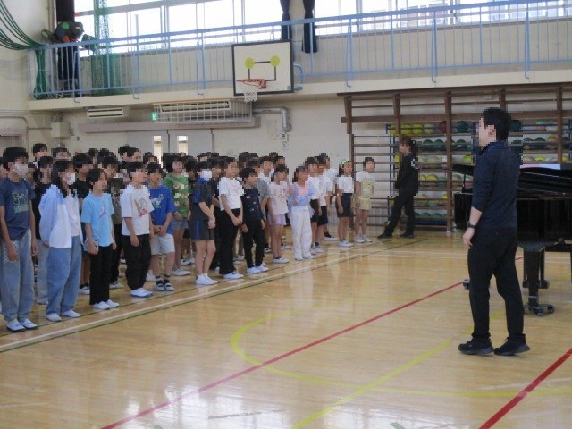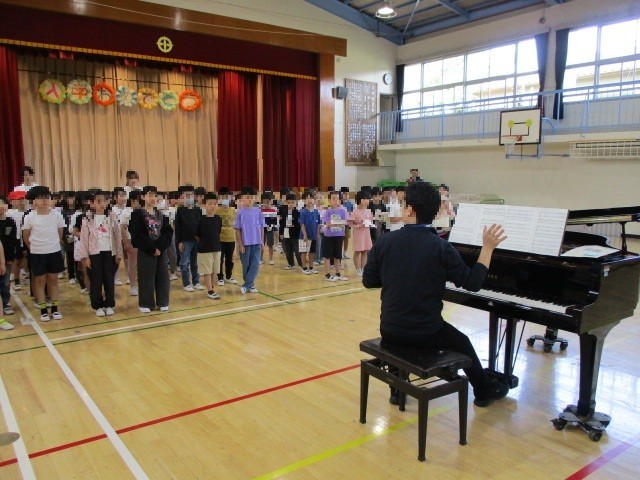 昨日(22日(水))、今年度初めての『音楽集会』がありました。4月17日にアップした記事(今年度1回目の『クロッキータイム』)同様、「音楽の担当教員」も今年度代わりました。そんな状況下での『音楽集会』でしたが、子どもたちの美しい歌声が体育館に響き渡りました! 歌った曲は、来週5月1日(金)に実施する「離任式」で歌う【大切なもの】。ピアノを体育館の中央に移動し、ステージ側に2・3年生が並び、体育倉庫側に4~6年生が並びました(1年生は「離任式」に参加しないため今回は不参加)。互いの歌声が重なって、きれいなハーモニーが奏でられました。加えて、5・6年生の一部は「アルトパート」にも挑戦! 2~4年生の「ソプラノパート」をしっかりと支えてくれました。5月1日の離任式…、今年の3月で上南を去られた先生方に「感謝の想い」を込めてしっかりと歌声を届けてほしいです。