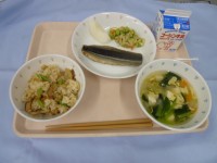 きのこピラフ・牛乳・レバーのカーリック揚げ・まめ豆サラダ・トマトとじゃが芋のスープ
