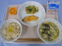 ごはん・ひじきとじゃこのふりかけ・牛乳・さばの香味焼き・小松菜とキャベツのお浸し・根菜とえのきのみそ汁・梨