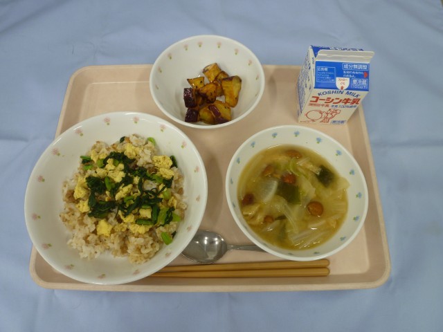 三色丼(そぼろ、たまご、こまつな)・牛乳・大学いも・なめこと白菜のみそ汁