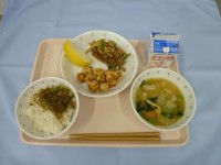 世界の料理~台湾~です。タンツー麺・牛乳・茎わかめのピリ辛あえ・地瓜球(ディーグアチウ:さつまいもボール)