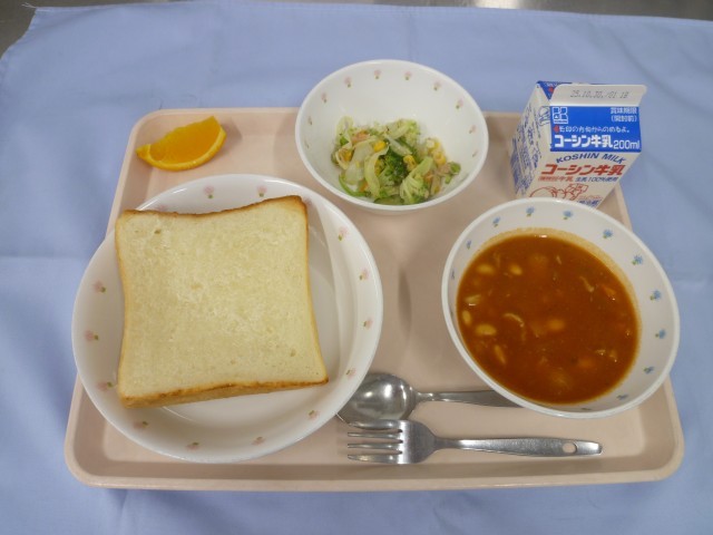 ヨーグルトースト・牛乳・ポークビーンズ・ツナとブロッコリーのサラダ・オレンジ