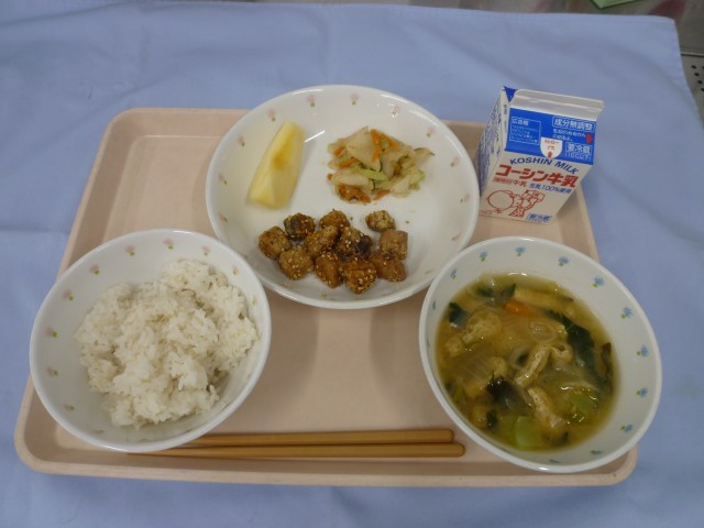 ごはん・牛乳・かつおの東煮・土佐漬け・油揚げのみそ汁・りんご