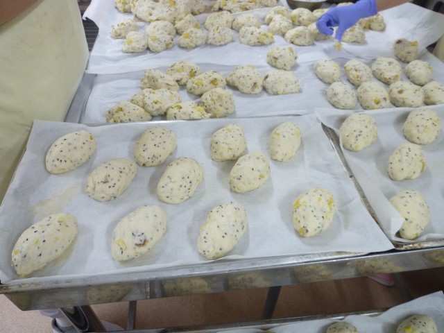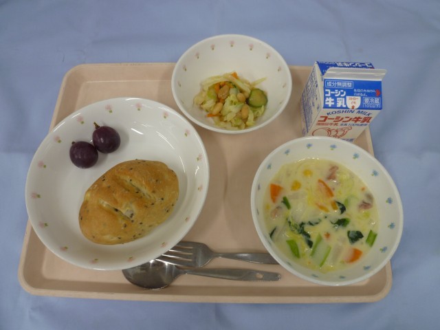 <南小岩ベーカリーの日>手作りさつまいもパン・牛乳・豚と白菜のクリームスープ・いんげん豆のサラダ・ぶどう