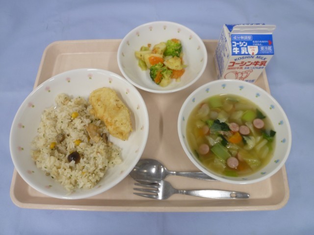 鶏ときのこのピラフ・牛乳・いかのカリカリ揚げ・カレーポテトサラダ・キャベツとレンズ豆のスープ