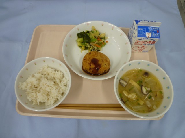 ごはん・牛乳・大豆コロッケ・キャベツと小松菜のからし和え・きのこのみそ汁です。