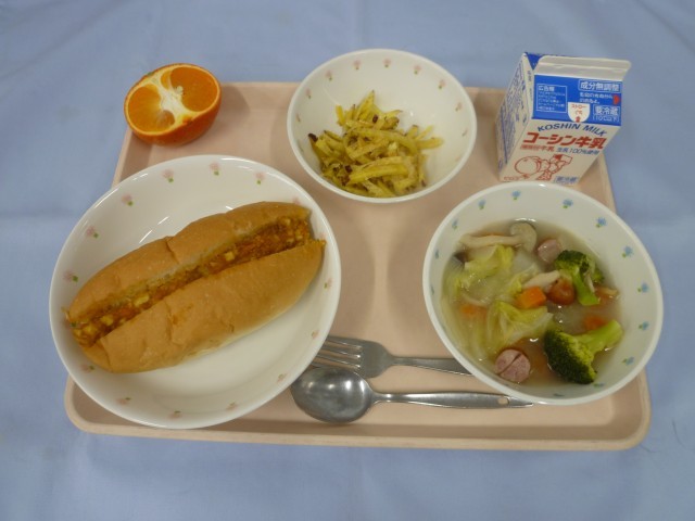カレーミートチーズドッグ・牛乳・白菜と大根のスープ煮・さつまいものセサミ揚げ・みかん(みはやみかん)