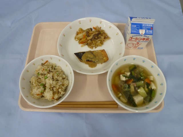 五目ごはん・牛乳・さばのごまみそかけ・はくさいと油揚げの煮びたし・けんちん汁