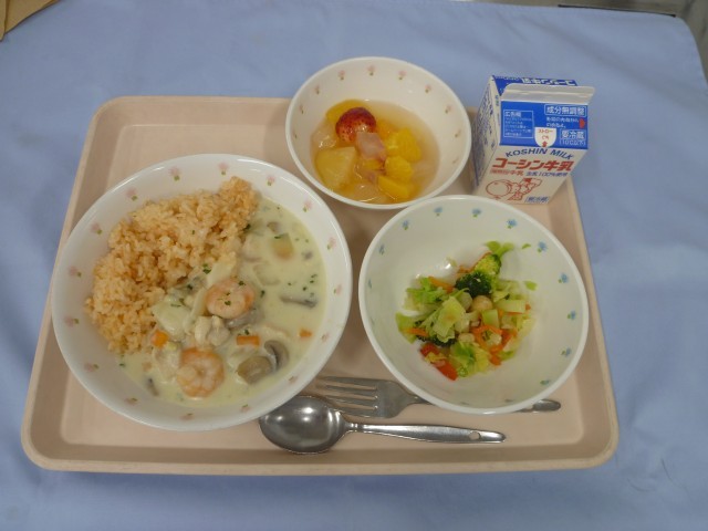 <お誕生日給食>えびクリームライス・牛乳・ひよこ豆のサラダ・フルーツポンチ