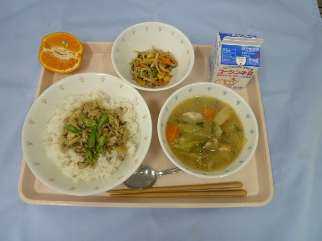<東京都の郷土料理>深川丼・牛乳・小松菜のごまあえ・ちゃんこ汁・ぽんかん