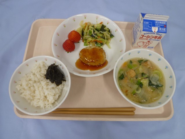 ごはん・のりの佃煮・牛乳・※あじバーグ・小松菜のゆずかあえ・かんも汁・いちご(とちあいか)です。