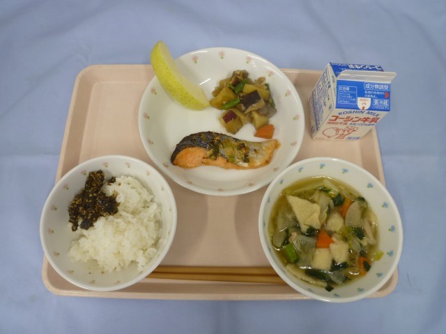 <青森県郷土料理>ごはん・わかめのにんにくしょうゆいため・牛乳・さけの香味焼き・ねりごみ・せんべい汁・りんご(王林)
