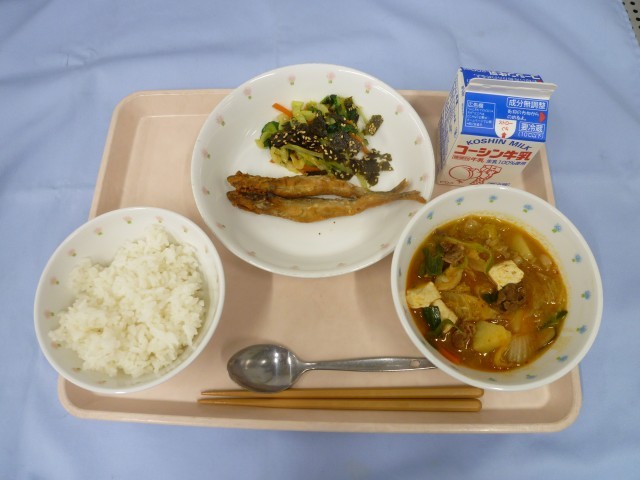 ごはん・牛乳・ししゃものから揚げ・チョレギサラダ・スンドゥブ
