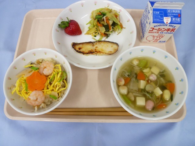 ちらしずし・牛乳・銀だらの西京焼き・小松菜のからし醤油あえ・麩のすまし汁・いちご(あまりん)