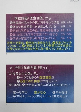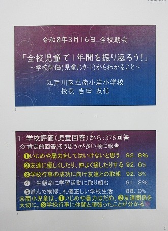 ◎全校朝会も今日と来週の2回のみとなりました。秋ごろにアンケートに答えてもらったことを憶えていますか。今日はその結果から、南小岩小児童の皆さんと一緒に1年間に頑張ったことと課題について考えたいと思います。