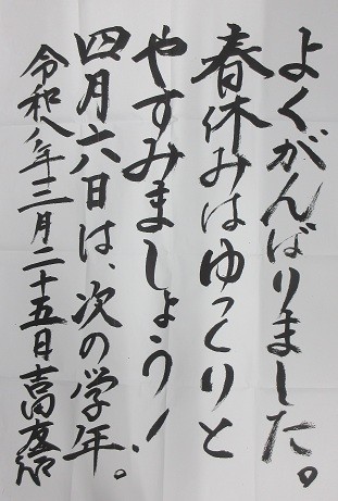 ・令和7年度は、1年間よく頑張りました。どんなゴムでも引っ張り続ければ切れてしまいますし、どんなバネでも引っ張り続ければ伸び切って縮まなくなってしまいます。だから、春休みは少しゆっくりと休むことも大切です。次に登校するときは、4月6日の第1学期始業式に次の学年として集合となります。