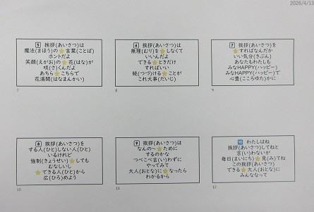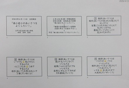 ◎おはようございます。今日は1回目の全校朝会です。児童の皆さんは1年間の目標があると思います。先生方お一人お一人にも、南小岩小校長としての私にも、令和8年度の1年間の目標があります。それは、4月6日の始業式でお話をしたことですが、覚えていますか。「南小岩小をよくしたい!」ということです。毎週、月曜日の全校朝会では、南小岩小学校をよくするために、一生懸命お話を考えて、全校の皆さんに伝えたいことを一生懸命に話します。今のように1年間聴いてほしいと思います。今日は、「南小岩小のあいさつをよくするために!」というお話をします。毎日、挨拶をしていて大切だなと思うことを10点にまとめました。