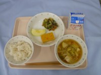 ごはん・小松菜ふりかけ・牛乳・さばの一夜干し・じゃがいもとさつま揚げの含め煮・豆腐だんご汁・メロン