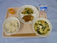ごはん・わかめそぼろ・牛乳・ししゃもの包み揚げ・ハリハリ和え・肉豆腐