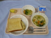 はちみつレモントースト・牛乳・めひかりのフリッター・みそ♪ドレサラダ・マカロニス...