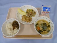 <和食の日給食>ごはん・ごまじゃこふりかけ・牛乳・鶏肉の香味焼き・小松菜野菜炒め...