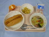 カレーミートチーズドッグ・牛乳・白菜と大根のスープ煮・さつまいものセサミ揚げ・み...