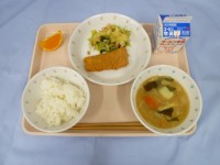 ごはん・牛乳・厚揚げの肉みそかけ・小松菜とキャベツの炒め物・いろどり汁・でこぽん