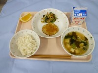 ごはん・牛乳・豆腐とひき肉の小判焼き・いそかあえ・新玉ねぎのみそ汁・みしょうかん