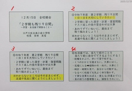 • 12月15日全校朝会「2学期も残り9日間」~学習・生活面で頑張ること~