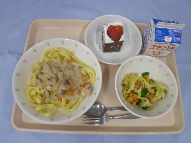 <2月お誕生日給食>生パスタのチキンときのこのクリームソース・牛乳・パプリカ入り...