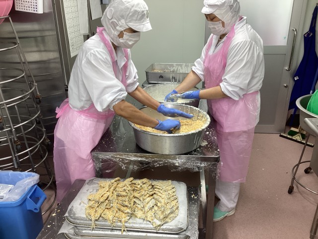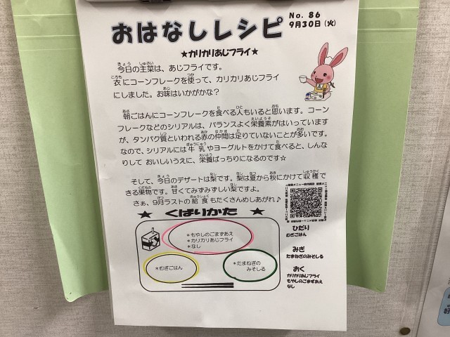 カリカリアジフライは、パンことコーンフレークをあわせたころもを、いちまいずつていねいにつけて、あぶらであげました。