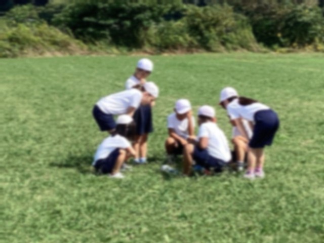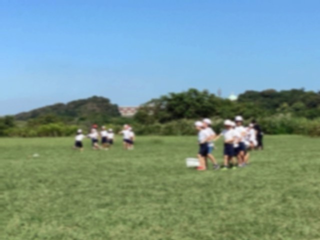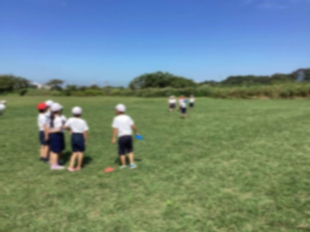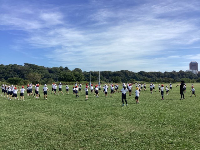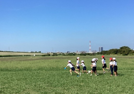 江戸川河川敷での体育の学習が始まり、1年が経ちました。今日の2年生の体育の学習は、小道具を使った運動遊びです。手にした小道具を使い、どんな運動遊びができるのか、アイディアを出しながら取り組んでいました。